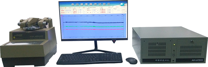 將待測材料放在轉盤(pán)上,兩個(gè)磨輪施加一定載荷,使其由轉盤(pán)帶動(dòng)以一定速度做旋轉磨耗運動(dòng)。試驗承受磨耗時(shí),樣件表面材料受全角度顆;蚪z織狀物磨損形成一完整的圓環(huán)。磨輪隨樣件盤(pán)轉動(dòng)面轉動(dòng),產(chǎn)生相對運動(dòng)和磨耗,而轉動(dòng)過(guò)程中磨輪軸相對于轉盤(pán)轉軸的偏移產(chǎn)生滑移運動(dòng),通過(guò)傳感器獲取摩擦時(shí)的扭矩信號,經(jīng)放大處理,輸入計算機經(jīng)A/D轉換將扭矩信號通過(guò)運算得到摩擦系數曲線(xiàn)。從而磨耗材料。